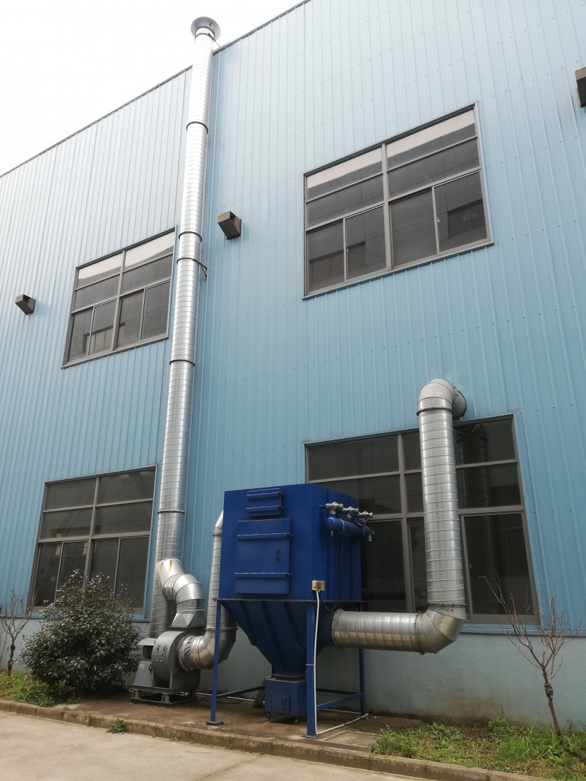 除塵裝置采用市面上主流的耐阻燃濾筒式焊煙除塵器,濾材采用防火阻燃材質(zhì),濾筒垂直設計安裝,維護方便;,總風量設計為8000m3/h,壓損設計為2500pa,采用11KW離心風機做為動力源。設計有移動式收集桶,方便灰塵收集和清理,煙囪按照環(huán)評標準設計高出屋頂2m左右,總高度保證在15m。工業(yè)粉塵治理中的濾筒選擇是整個系統(tǒng)的核心關鍵,包括數(shù)量和材質(zhì)等等;