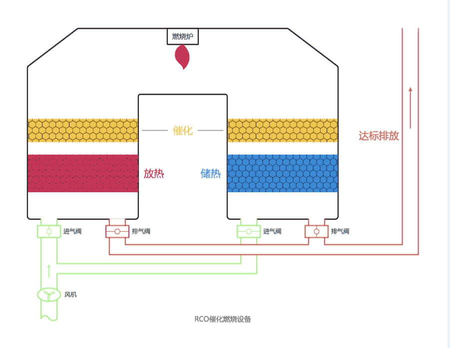 催化燃燒設備工作原理,在工業(yè)生產(chǎn)過程中,排放的有機尾氣通過引風機進入設備的旋轉(zhuǎn)閥,通過選轉(zhuǎn)閥將進口氣體和出口氣體完全分開。氣體首先通過陶瓷材料填充層(底層)預熱后發(fā)生熱量的儲備和熱交換,其溫度幾乎達到催化層(中層)進行催化氧化所設定的溫度,這時其中部分污染物氧化分解;廢氣繼續(xù)通過加熱區(qū)(上層,可采用電加熱方式或天然氣加熱方式)升溫,并維持在設定溫度;其再進入催化層完成催化氧化反應,即反應生成CO2和H2O,并釋放大量的熱量,以達到預期的處理效果。