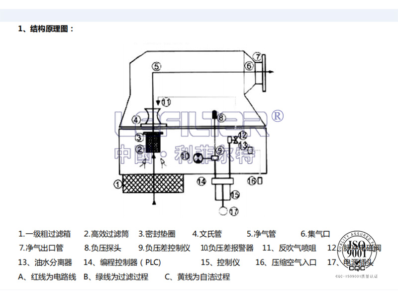 過濾過程: 含塵空氣經(jīng)空氣壓縮機(jī)吸氣作用,從一級(jí)粗過濾箱①吸入,經(jīng)過高效過濾筒②,由于重力慣性、擴(kuò)散、接觸阻留等綜合作用,塵埃被吸附在高效過濾筒上,潔凈空氣通過密封墊圈③進(jìn)入文氏管④到凈氣室⑤匯合到集氣口⑥再?gòu)膬魵獬隹诠?/span>⑦被空壓機(jī)吸入。