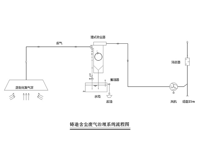 解決以上問題的關(guān)鍵點(diǎn)在于鑄造過程中釋放高溫,粉塵上升速度很快,釋放大量的重金屬粉塵和廢氣,需要定制化設(shè)計(jì)耐高溫集氣罩并且集氣罩要完全覆蓋高溫?zé)焿m擴(kuò)散區(qū)域,風(fēng)速設(shè)計(jì)合理這樣才能捕集95%以上的粉塵,含塵廢氣通過管道被輸送到濕式除塵器中,含塵廢氣與水充分接觸,通過特有的結(jié)構(gòu)充分和水接觸吸收、去除其中大部分顆粒污染物及部分異味,處理后的氣體可以通過室外煙囪直接排放到大氣中。