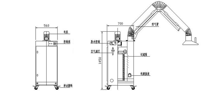 1)凈化器同離心風(fēng)機(jī),濾筒過(guò)濾室,進(jìn)風(fēng)均流板,集塵抽屜,凈化器室體,脈沖清灰系統(tǒng),電控裝置及帶吸塵罩柔性吸氣臂組成.