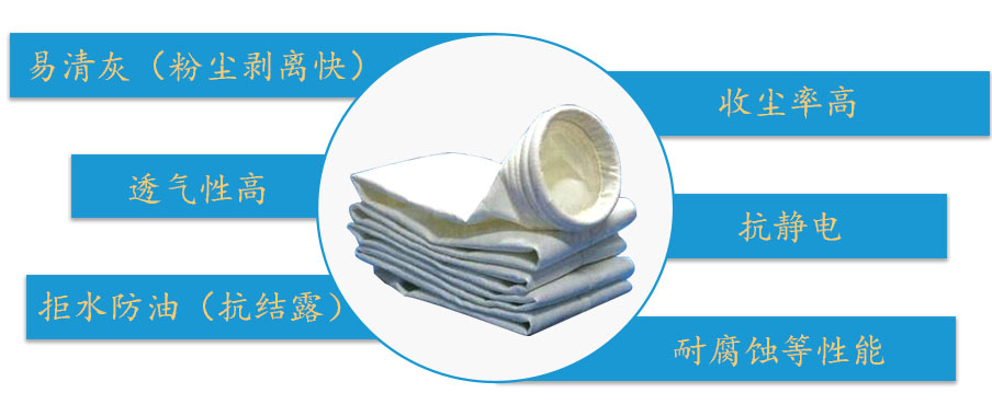 濾袋采用玻纖基布和化學(xué)纖維混合針刺而成。產(chǎn)品具有耐磨性能好、抗拉強(qiáng)度高。正常使用溫度150℃,短時(shí)180℃。適用于溫度適宜、煙塵濃度高、過(guò)濾要求高的煙塵過(guò)濾行業(yè)。1、表面未完濾效率高:通常工業(yè)用濾材是深層過(guò)濾。它是依賴于在濾材表面先建立一次粉塵層而達(dá)到過(guò)濾。建立過(guò)濾時(shí)間長(zhǎng),阻力大,效率低,截留不 ,過(guò)濾和反吹壓力高,清灰頻繁,能耗較高,使用壽命不長(zhǎng),設(shè)備占地面積大。使用覆膜除塵濾袋濾料,粉塵不能透入濾料,是表面過(guò)濾,無(wú)論是粗,細(xì)粉塵,全部沉積在濾料表面,即靠膜本身孔徑截留被濾物,無(wú)初濾期,開(kāi)始就是過(guò)濾,近的時(shí)間處于過(guò)濾。