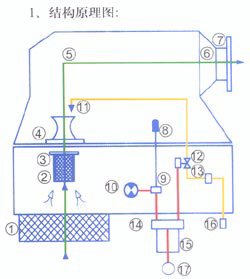 1、結(jié)構(gòu)原理圖: ⒈一級粗過濾箱 11、反吹氣噴咀 ⒉高效過濾筒 12、脈沖電磁閥 ⒊密封墊圈 13、油水分離器 ⒋文氏管 14、編程控制器(PLC) ⒌凈氣管 15、控制儀 ⒍集氣口 16、壓縮空氣入口 ⒎凈氣出口管 17、電源插頭 ⒏負(fù)壓探頭 A、紅線為電路線 ⒐負(fù)壓差控制儀 B、綠線為過濾過程 ⒑負(fù)壓差報警器 C、黃線為自潔過程 |