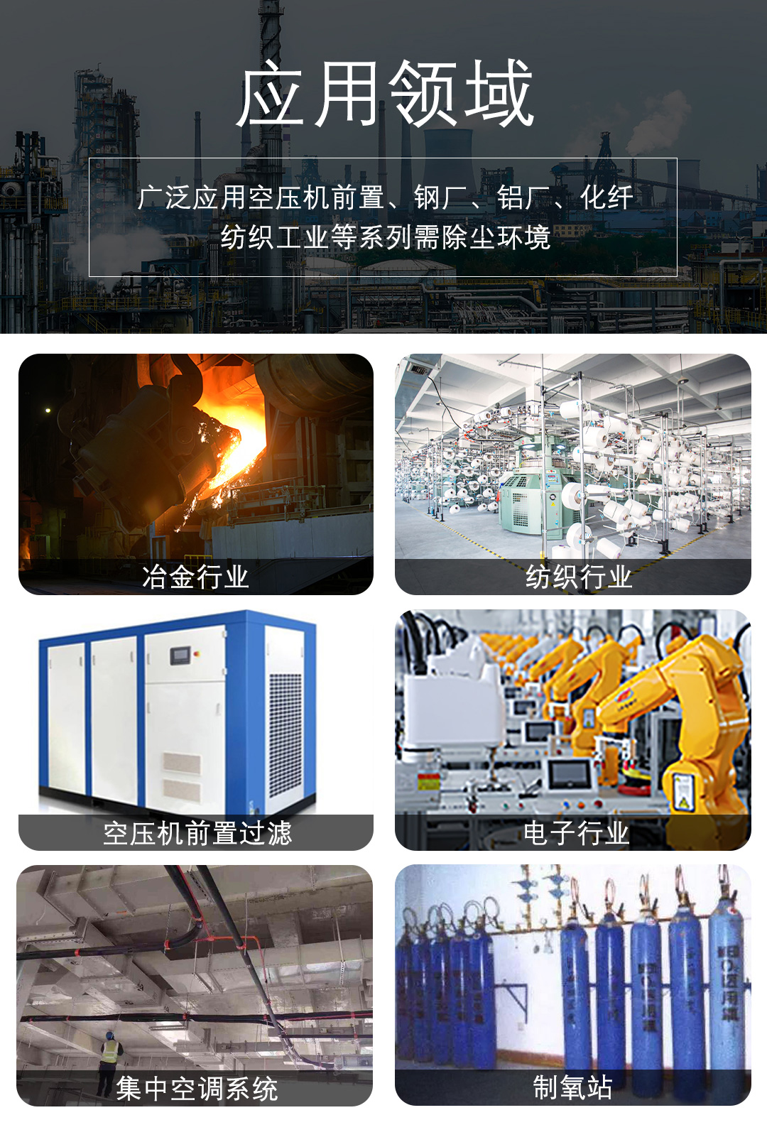 廣泛應(yīng)用于:冶金行業(yè),紡織行業(yè),空壓機(jī)前置過濾,電子行業(yè),集中空調(diào)系統(tǒng),制氧站
